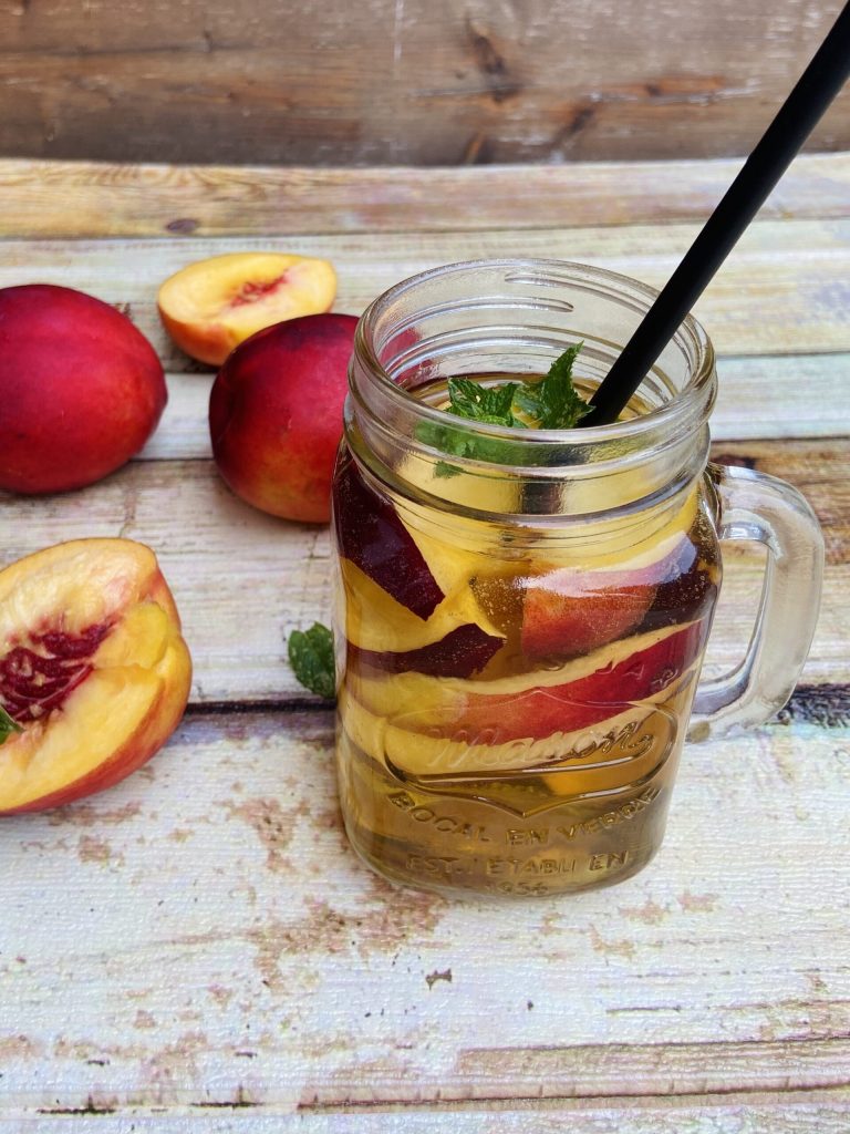 Unser Hausgemachter Pfirsicheistee ist fertig. Servieren wir ihn in großen Gläsern mit Pfirsichscheiben und ein paar Minzblättern!