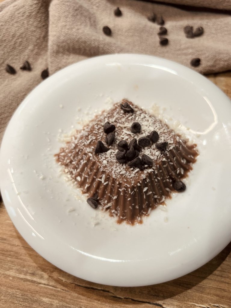 • Unser Kokos- und Schokoladenpudding ist fertig. Wir formen ihn aus und dekorieren ihn mit Schokoladentropfen und Kokosmehl.