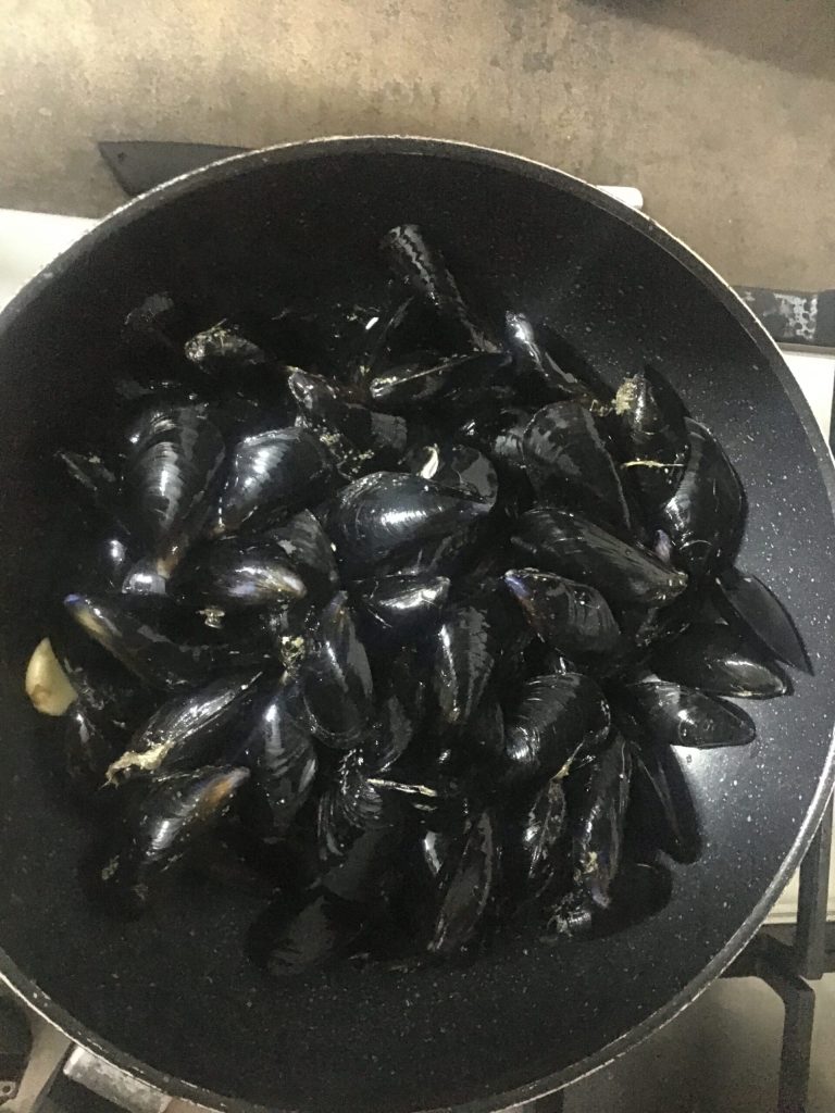 In einem separaten Topf öffnen wir die Miesmuscheln mit einer Zehe Knoblauch, einem Schuss extra nativem Olivenöl und einem Schuss Weißwein. Wir filtern das freigesetzte Wasser und fügen es dem warmen Fischfond hinzu. Die Hälfte der Miesmuscheln schälen wir und halten sie warm, bedeckt.