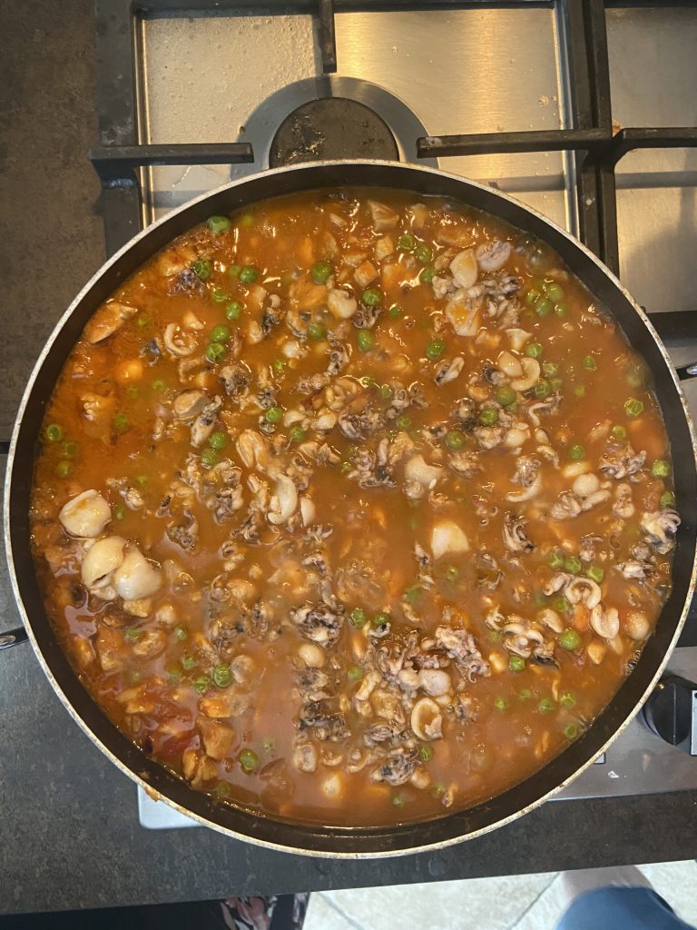 Wir fügen dann die warmen Fischbrühe hinzu: Das Kochen dauert etwa 20 Minuten, wobei immer eine Flüssigkeitsmenge gleich dem doppelten Volumen des Reises, in diesem Fall 600 ml Fischbrühe, beibehalten wird.Wichtiger Hinweis: Die Paella niemals umrühren. Während des Kochens, wenn nötig, bewegen wir sie nur, indem wir die Griffe der Paellera benutzen.