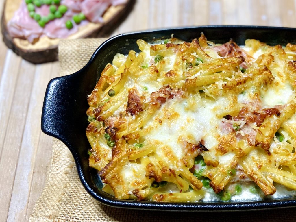 Heute bereiten wir zusammen überbackene Nudeln mit Erbsen und Schinken zu, ein Hauptgericht reichhaltig und schmackhaft, perfekt für Sonntage in Familie oder für Feste und zum Genießen in Gesellschaft von Freunden und Verwandten.