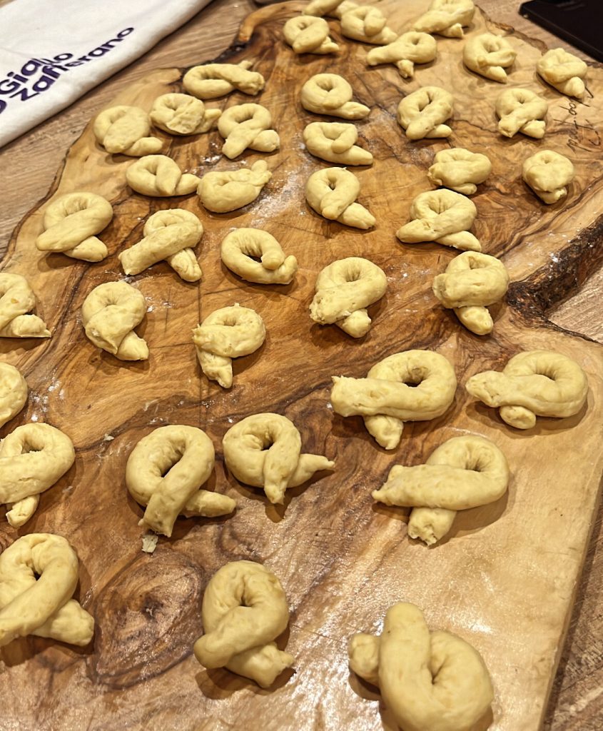 In ca. 3 cm lange Stücke schneiden und leicht formen, um die typische Tarallini-Form zu erhalten.