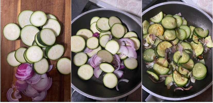 Wir fügen die Zucchini und die Zwiebeln hinzu und braten sie bei mittlerer bis niedriger Hitze, bis sie zart und leicht gebräunt sind.