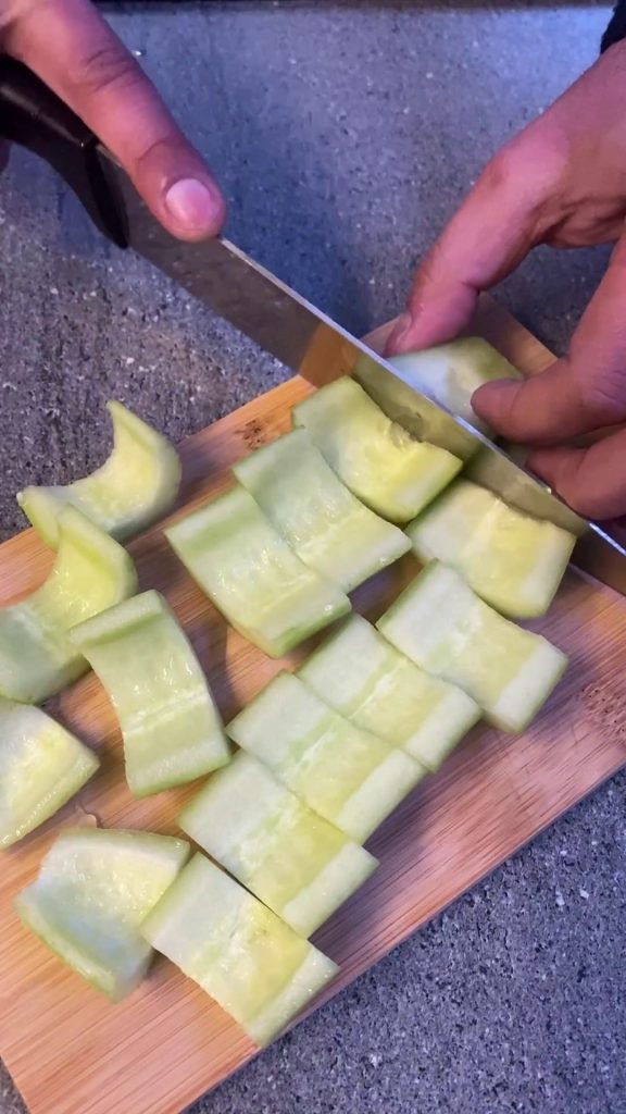 Zuerst schäle die Gurke und entferne die äußere Schale