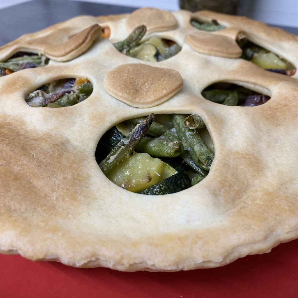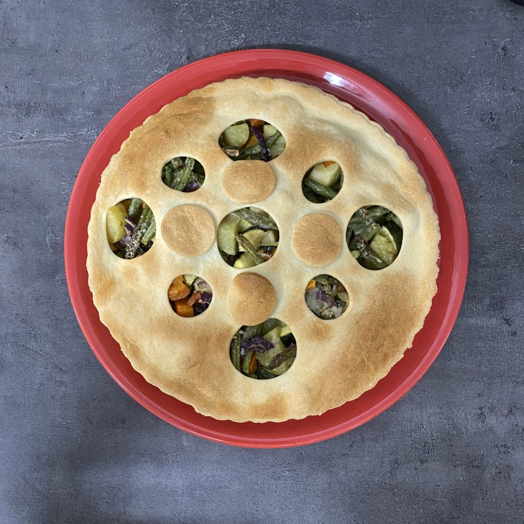 In jedem Fall ist es diesmal ein herzhafter, rustikaler Kuchen, der mit fertigem Mürbeteig und einem Gemüsemix zubereitet wird, der zunächst im Heißluftfritteuse vorgegart und dann im Ofen fertiggestellt wird. Das Ergebnis war sehr zufriedenstellend und mit dem übrig gebliebenen Teig habe ich es geschafft, auch ein Dessert zuzubereiten!
