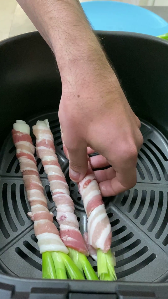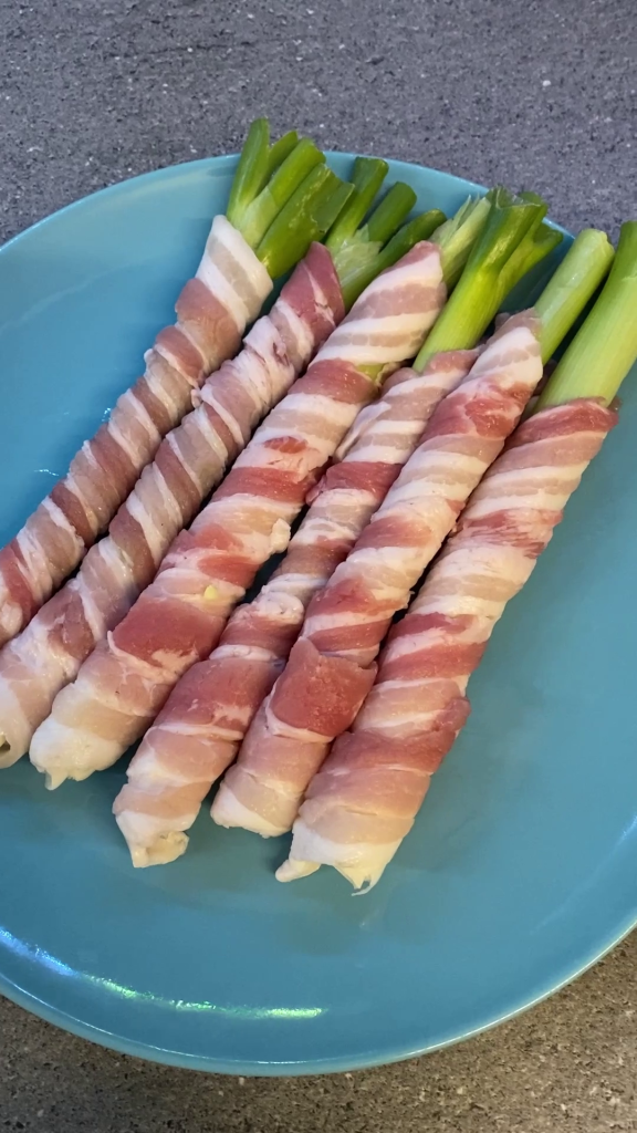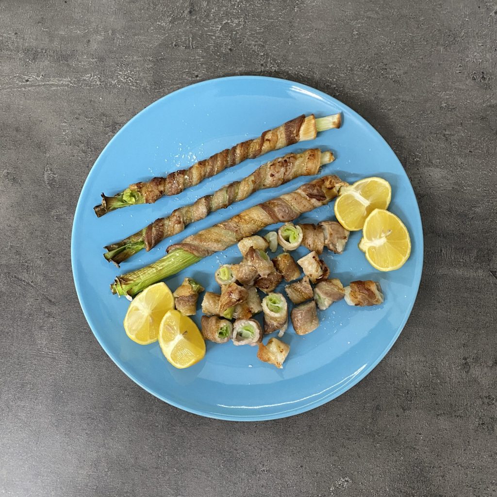 • An dieser Stelle wickel eine Scheibe Speck von der Basis der Frühlingszwiebel bis zur Spitze auf