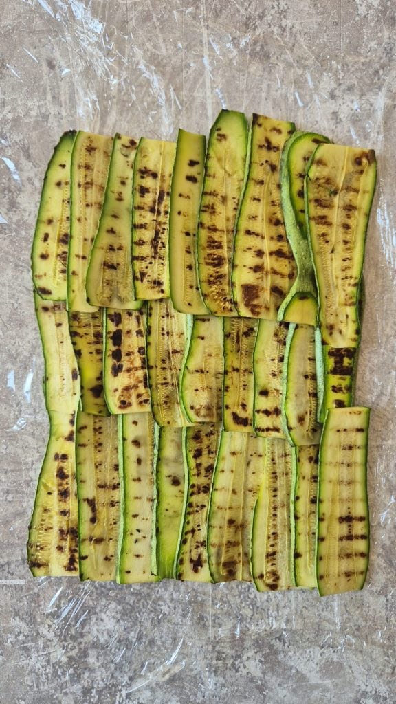Sobald die Zucchini gegrillt sind, legen Sie sie auf Küchenpapier, um überschüssiges Restwasser zu entfernen.