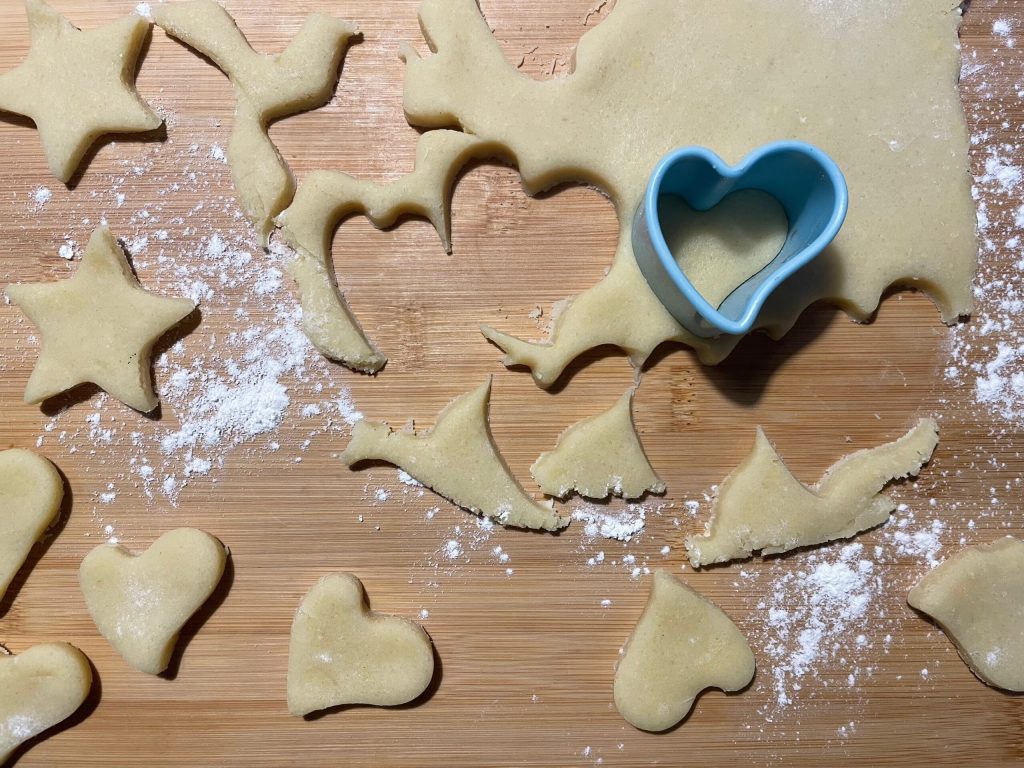 Nach der Ruhezeit den Teig mit Hilfe eines Nudelholzes und etwas Mehl auf 3-4 mm Dicke ausrollen. Mit Ausstechformen die gewünschten Kekse ausstechen. Auf ein mit Backpapier ausgelegtes Blech legen und im vorgeheizten statischen Ofen bei 180° ca. 12 Minuten backen. Herausnehmen und abkühlen lassen.