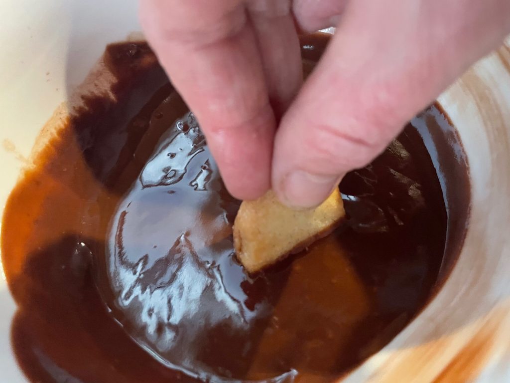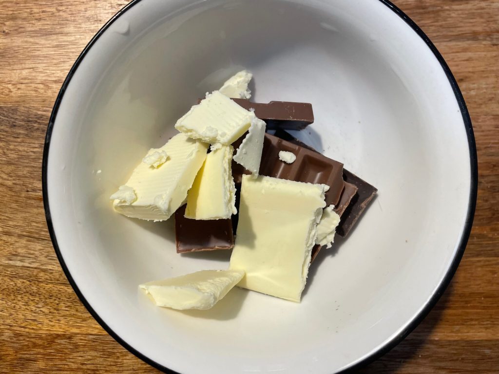 Die beiden Schokoladensorten mit der Butter schmelzen. Wenn die Kekse kalt sind, zur Hälfte eintauchen. Auf Backpapier oder einem Gitterrost abkühlen lassen.
