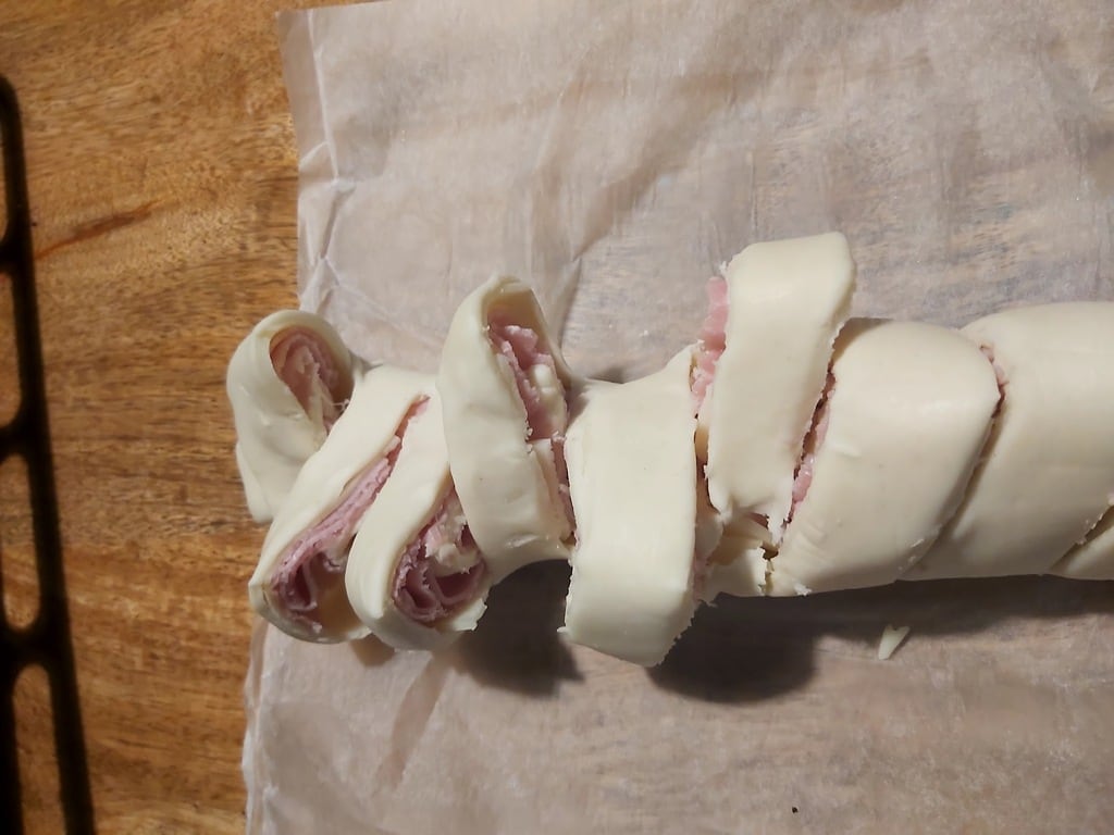 Ich nehme den Blätterteig normalerweise etwa zehn Minuten vor dem Ausrollen aus dem Kühlschrank. Dies verhindert, dass er reißt, wenn man ihn ausrollt, da er zu steif ist. Wir schneiden den Scamorza in kleine Stücke. Auf den Blätterteig legen wir den Aufschnitt (ich vegan) und den Käse und bedecken den Blätterteig vollständig.