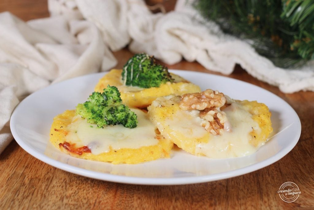 Lege die Polenta-Scheiben auf das mit Backpapier ausgelegte Blech, belege einige mit Scamorza, Brokkoliröschen und Parmesan und andere mit Gorgonzola und Walnüssen. Etwas Pfeffer darüber und im vorgeheizten statischen Ofen bei 180° einige Minuten backen, gerade genug, um den Käse zum Schmelzen zu bringen. Sie schmecken sowohl warm als auch kalt.