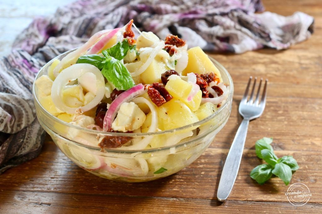 Ein Gericht, das kalt serviert wird, einfach und schmackhaft, ist der kalte Kartoffelsalat ideal, um ihn in der warmen Jahreszeit auf den Tisch zu bringen. Angereichert mit Mozzarella, getrockneten Tomaten und in Essig eingelegten Zwiebeln ist er wirklich nahrhaft und sehr lecker. Wir müssen nur noch an die Arbeit gehen und gemeinsam den kalten Kartoffelsalat zubereiten.