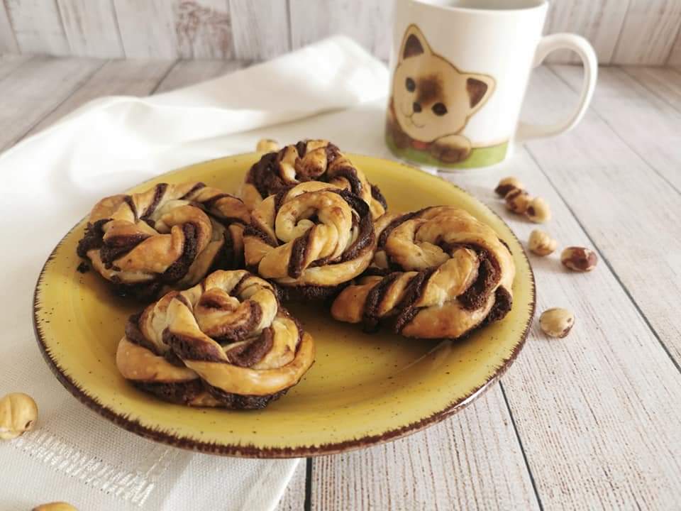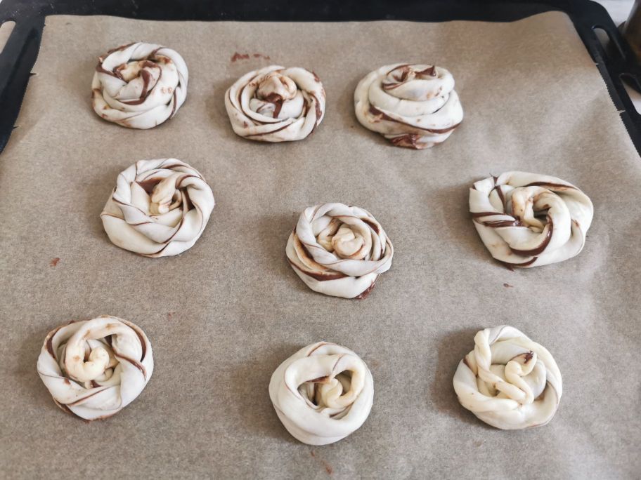 • Wickeln Sie den Streifen um sich selbst, bis Sie dieses Ergebnis erzielen. Dekorieren Sie nach Belieben. Backen Sie sie bei 180° für 15 Minuten in einem vorgeheizten statischen Ofen. Wenn sie goldbraun sind, nehmen Sie sie heraus und lassen Sie sie abkühlen
