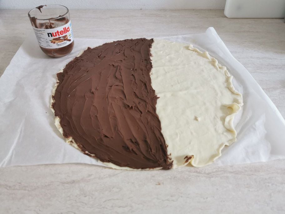• Rollen Sie den Blätterteig mit dem Nudelholz aus. Mit einem Löffel verteilen Sie die Nutella auf die Hälfte des Teigs