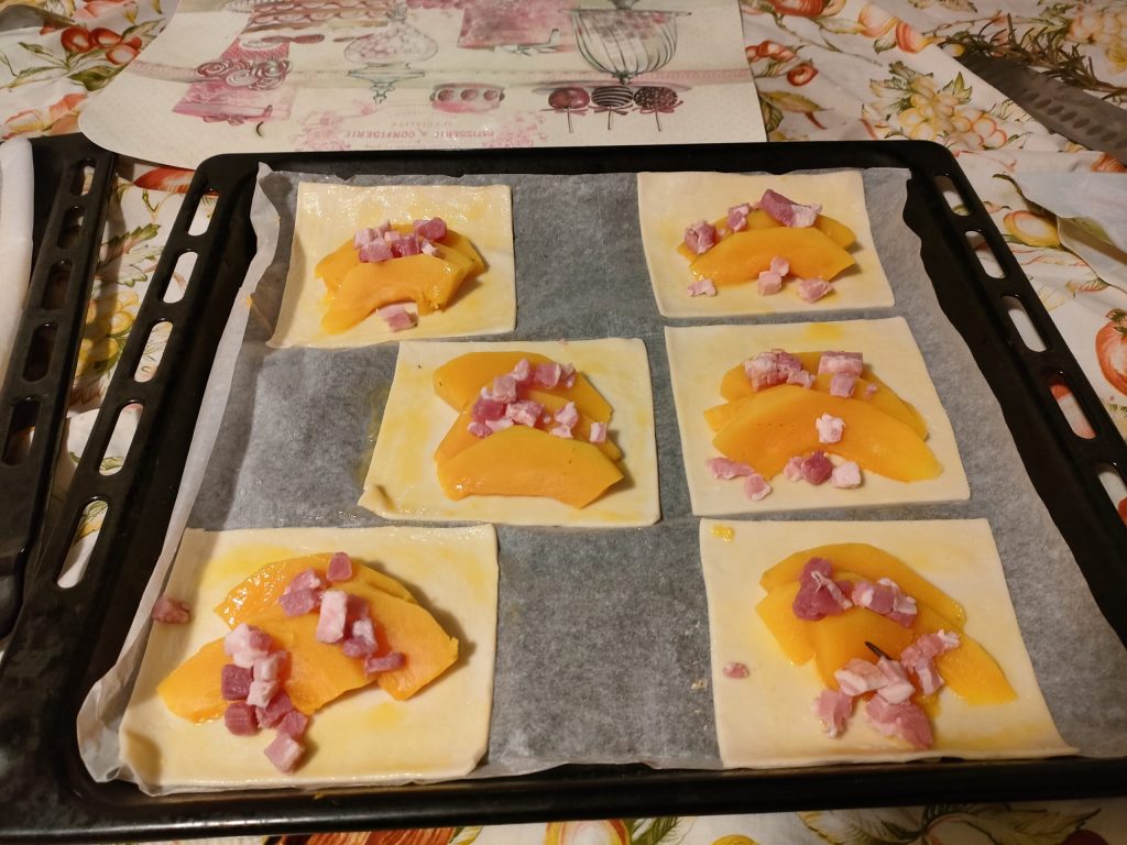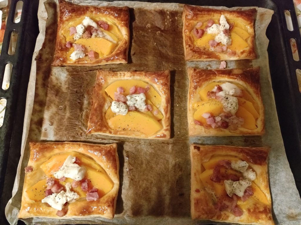 Auf einem mit Backpapier belegten Blech die Blätterteigrechtecke auslegen und mit etwas Öl bestreichen. Dann den Kürbis und die Speckwürfel hinzufügen, etwas Pfeffer darüberstreuen. Bei 180° C etwa 15 Minuten im Ofen backen