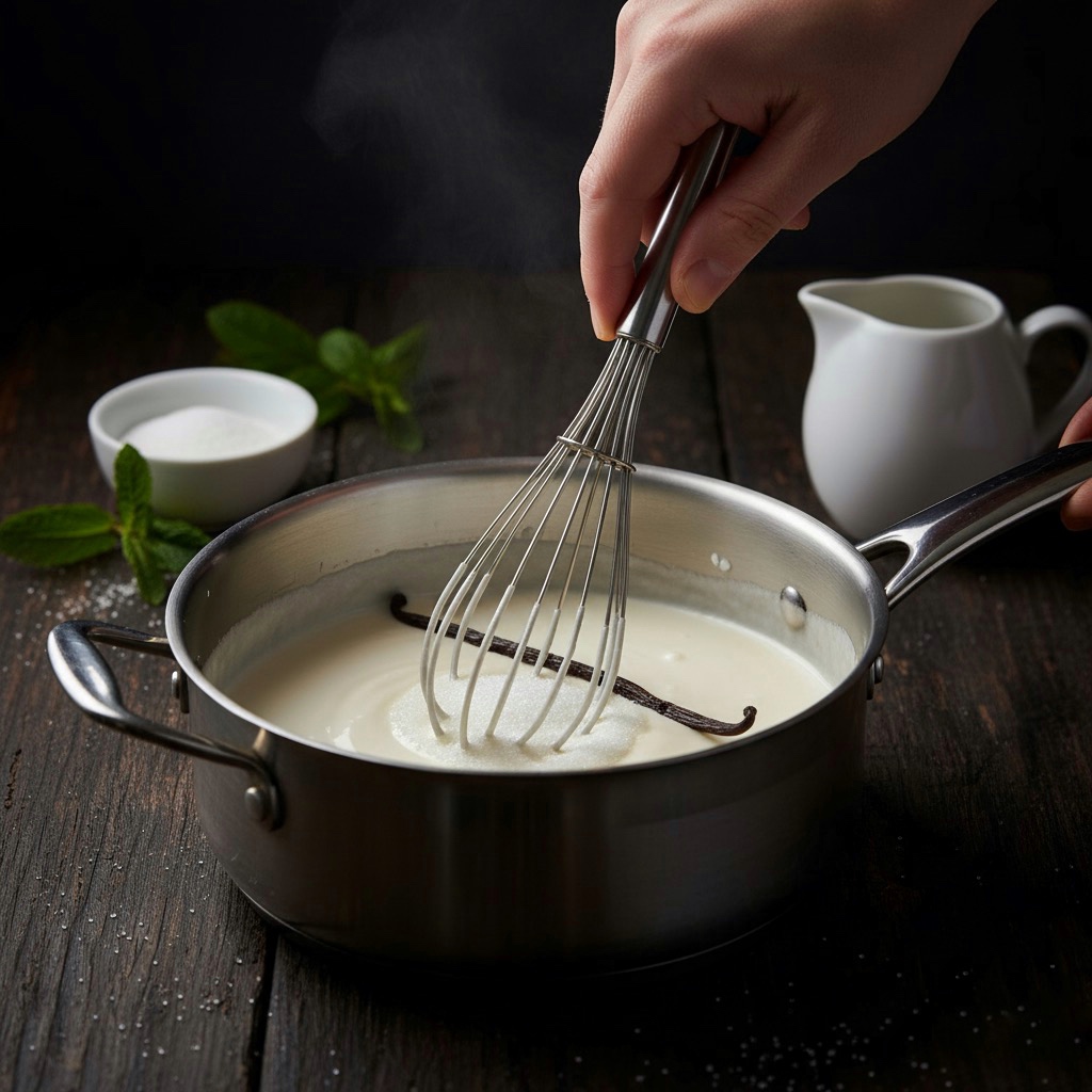 Gelatine auflösen: Drücke die eingeweichten Gelatineblätter gut aus, um überschüssiges Wasser zu entfernen. Füge sie zum Topf mit der warmen Sahne hinzu und rühre kräftig, bis sie vollständig aufgelöst sind und die Mischung glatt ist. Lass sie abkühlen.