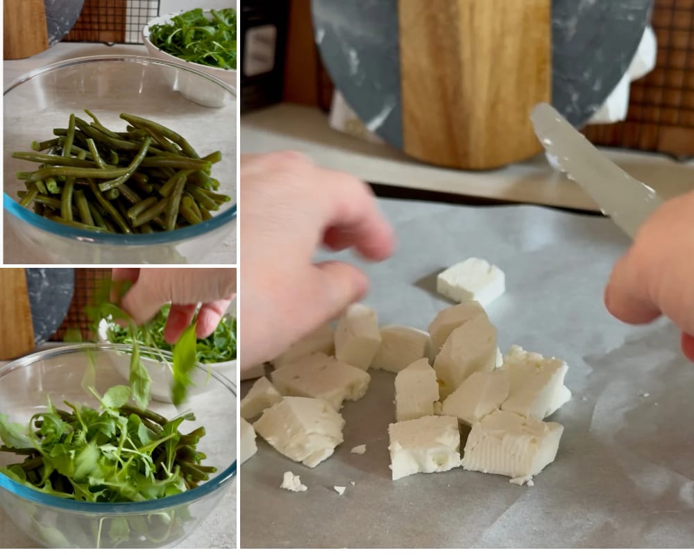 Nehmen Sie die Hälfte des Fetas und schneiden Sie ihn in kleine Stücke, legen Sie sie in eine kleine, mit Backpapier ausgelegte Form und backen Sie sie bei 180° für 15 Minuten, bis sie goldbraun sind. (Wenn Sie es roh bevorzugen, überspringen Sie diesen Schritt). In einer Schüssel die Bohnen, sobald sie abgekühlt sind, mit 2 Esslöffeln Öl, einem Spritzer Zitronensaft, einer Handvoll Rucola, wenig Salz und Pfeffer würzen. Beiseite stellen