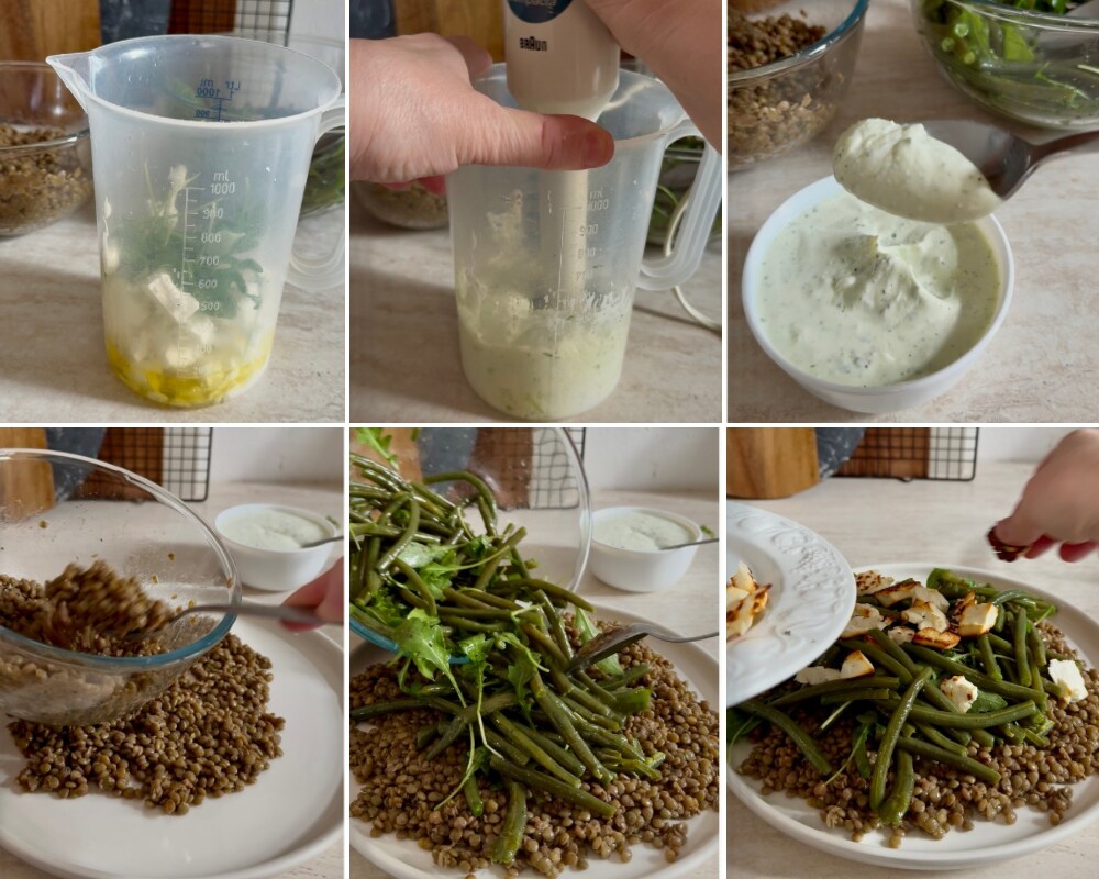 Wir bereiten die Feta-Joghurt-Soße vor: In einer Schüssel den griechischen Joghurt, den zerbröckelten Rest des Fetas, den Zitronensaft, 2 Esslöffel extra natives Olivenöl, Salz und Pfeffer mischen. Gut mit einer Gabel oder einem Schneebesen verrühren, bis eine cremige Soße entsteht. Wenn gewünscht, einige gehackte Minze- oder Dillblätter hinzufügen. Wir komponieren den Salat: Auf einem Servierteller die Linsen anrichten, den Bohnensalat mit gebackenem Feta darüber verteilen und mit der Soße servieren