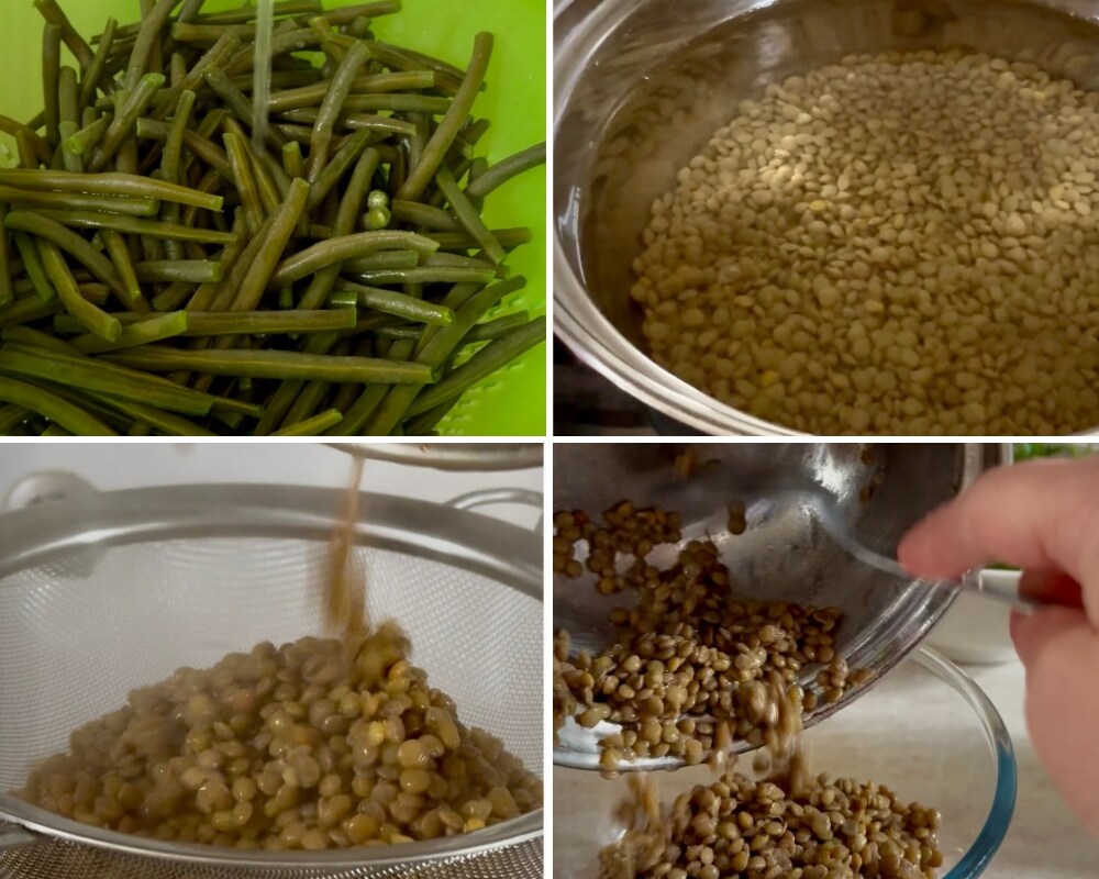 Wir bereiten die Bohnen vor: Spitzen Sie die Bohnen, waschen Sie sie und kochen Sie sie in kochendem Salzwasser für etwa 10 Minuten, bis sie zart, aber noch knackig sind. Abgießen und unter kaltem Wasser abspülen, um die leuchtende Farbe zu erhalten und das Kochen zu stoppen. Wir lassen die Linsen abtropfen: Wenn Sie Dosenlinsen verwenden, lassen Sie diese gut abtropfen und spülen Sie sie unter fließendem kaltem Wasser ab. Wenn Sie getrocknete Linsen haben, kochen Sie sie etwa 20 Minuten in Wasser. Zwiebel und Knoblauch fein hacken. Nehmen Sie die Linsen und würzen Sie sie mit dieser Mischung, 2 Esslöffeln Öl, einer Prise Salz und Pfeffer und stellen Sie sie beiseite.