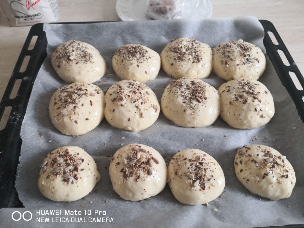 Legen Sie die Brötchen auf ein mit Backpapier bedecktes Blech und bestreichen Sie sie mit zuvor mit einer Gabel verquirltem Eigelb und Milch, vor und nach dem Aufgehen. Lassen Sie zwischen den Brötchen 4-5 cm Platz und lassen Sie sie in einem warmen Raum aufgehen, bis sie ihr Volumen verdreifacht haben. Dies dauert etwa eineinhalb Stunden.