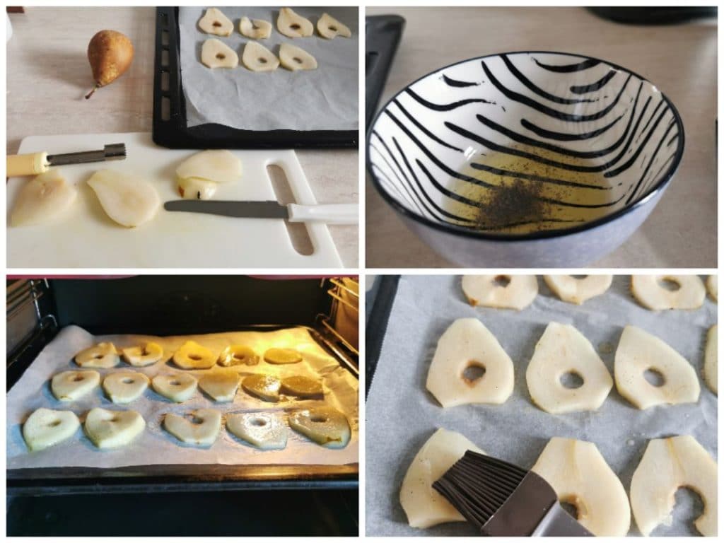 Fangen wir an, den Ofen auf 180° vorzuheizen. Waschen Sie die Birnen und schneiden Sie vertikale Scheiben mit einer Dicke von 6 mm. Entfernen Sie das Kerngehäuse und die Samen. Legen Sie die Birnenscheiben auf ein mit Backpapier ausgelegtes Blech, bestreichen Sie sie mit der Mischung aus geschmolzener Butter und Pfeffer oder Olivenöl und Pfeffer. Bestreichen Sie die Birnen sowohl oben als auch unten und backen Sie sie bei 180° für 25 Minuten.