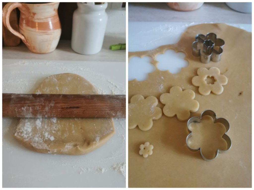Wir nehmen den Teig und rollen eine 5 mm dicke Platte aus. Mit einem runden Ausstecher schneiden wir viele Scheiben aus. In der Hälfte davon machen wir mit einem kleineren Ausstecher ein Loch in der Mitte.