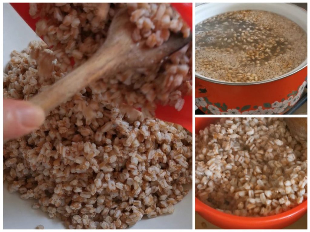 • Wir kochen den Dinkel in Salzwasser nach den Anweisungen auf der Packung. Gut abtropfen lassen, in eine große Schüssel geben und mit etwas Öl würzen, mischen und abkühlen lassen