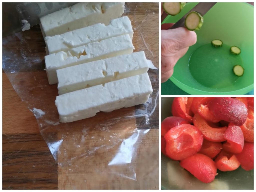 • Schneidet den Feta in Würfel. Wascht 2 Zucchini und schneidet sie in Scheiben. Reibt die Schale einer Zitrone ab und gebt den Saft in ein Schälchen. Schneidet die Aprikosen schließlich in 4 Stücke