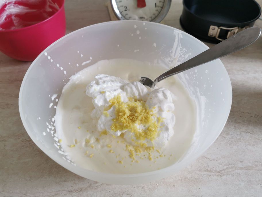 Vermischen Sie alle Mischungen vorsichtig mit einem Spatel von oben nach unten. Fügen Sie die geriebene Schale und den Saft einer halben Zitrone hinzu. Gießen Sie die Creme in eine runde Form von etwa 16 cm, ausgekleidet mit feuchtem Backpapier, ebnen Sie die Mischung mit einem Spatel ein und stellen Sie sie für etwa 4 Stunden in den Gefrierschrank