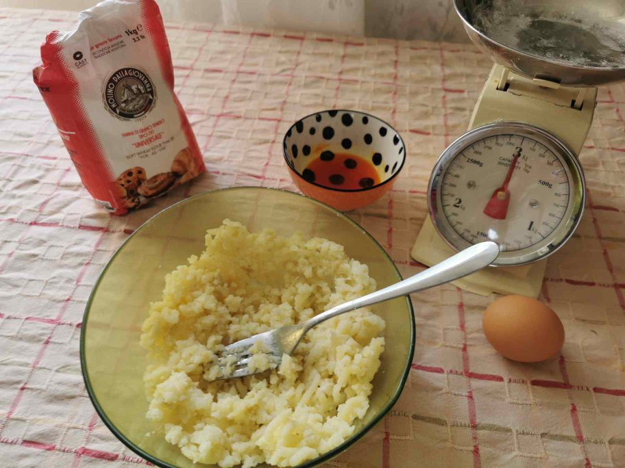 Sobald sie abgekühlt sind, Mehl, Ei und Safran hinzufügen, Salz dazugeben und zu einem homogenen und elastischen Teig verarbeiten. Viele runde Gnocchi formen, etwa in der Größe einer Walnuss, ein Loch in der Mitte machen, um eine Vertiefung für die Füllung zu schaffen, und beiseite stellen