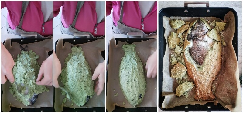 Kümmern wir uns um den Goldbarsch, der bereits gereinigt ist, füllen Sie ihn mit Zitronenscheiben. Legen Sie das Salz auf den Boden des mit Backpapier ausgelegten Backblechs und fügen Sie den gefüllten Goldbarsch hinzu. Bedecken Sie ihn mit dem Selleriesalz und folgen Sie der Form des Fisches. Lassen Sie den Bereich um das Auge unbedeckt, damit Sie die Garstufe gut sehen können (wenn das Auge weiß ist, ist der Fisch gar). Backen Sie ihn 35 Minuten bei 180 °C, nehmen Sie ihn aus dem Ofen, brechen Sie die Salzkruste auf, entfernen Sie die Haut und die Gräten und filetieren Sie ihn. Sofort servieren