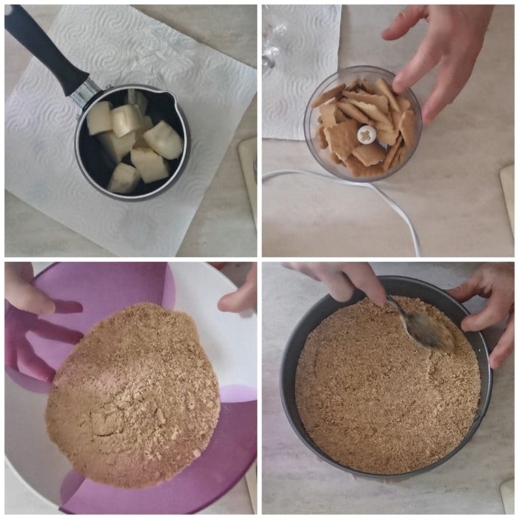 • Wir beginnen damit, die Gelatineblätter in kaltem Wasser einzuweichen und weich werden zu lassen. Butter in einem Wasserbad schmelzen und abkühlen lassen. Die Kekse zerbröckeln, in einem Zerkleinerer hacken, in eine Schüssel geben und die geschmolzene Butter darüber gießen. Die Masse auf dem Boden einer Springform mit einem Durchmesser von 20 cm festdrücken und etwa 30 Minuten in den Kühlschrank stellen