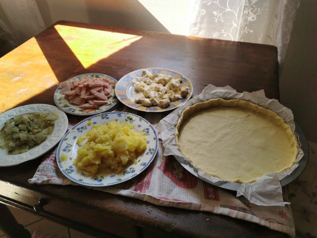 Rollen wir den Blätterteig aus und bedecken eine runde Backform von etwa 26 cm. Stechen wir den Teig mit einer Gabel ein, geben wir die zerdrückten Kartoffeln hinein und nivellieren, fügen wir den Gorgonzola, den in Würfel geschnittenen Schinken, die vorher gekochten und in Stücke geschnittenen Mangoldstiele hinzu.