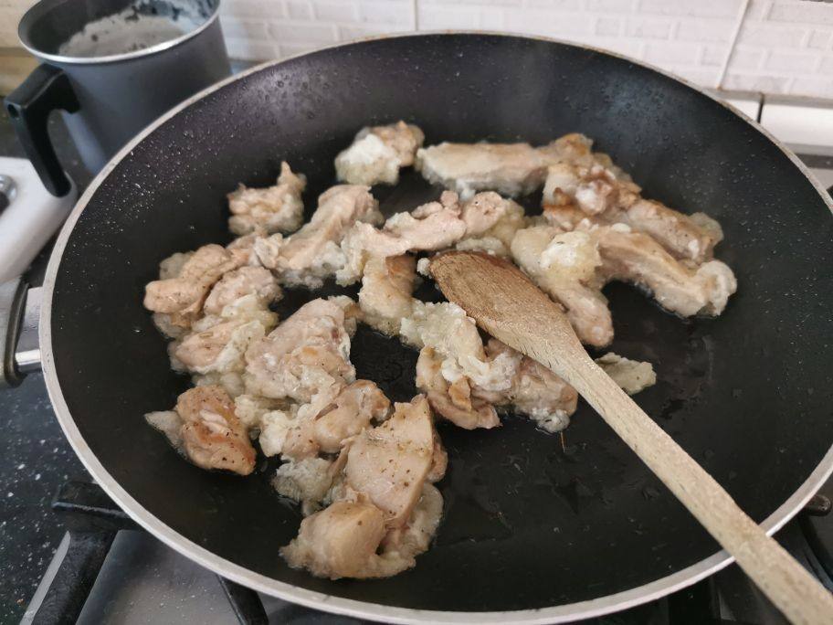 In einer großen Pfanne erhitzen Sie einen Schuss Öl und braten Sie die Hühnerstücke 10 Minuten auf beiden Seiten an. In der Zwischenzeit lösen Sie einen gehäuften Esslöffel Maisstärke im Weißwein auf, fügen Sie es dem Huhn hinzu, und sobald es fast vollständig verdampft ist, geben Sie die Mandelmilch dazu und lassen Sie es weitere 4 Minuten kochen, fügen Sie eine Prise Salz hinzu