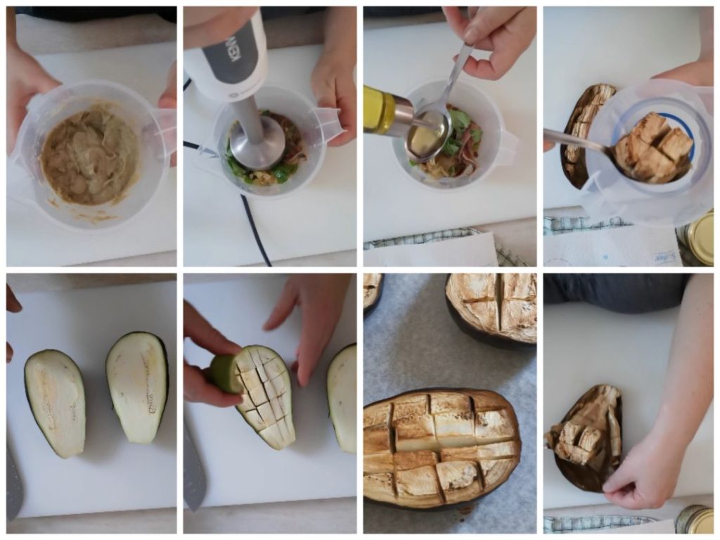 Wir schneiden die Aubergine in der Mitte durch und ritzen das Innere kreuzweise ein. Sie wird auf einer Auflaufform, die mit Backpapier ausgelegt ist, aufgelegt und bei 180° für 20 Minuten gebacken. Sobald sie fertig ist, entfernen wir das Fruchtfleisch, das wir in einen Mixer geben, zusammen mit 2 Esslöffeln Öl, den Sardellen, dem Basilikum (5 oder 6 Blätter) und dem Saft einer halben Zitrone