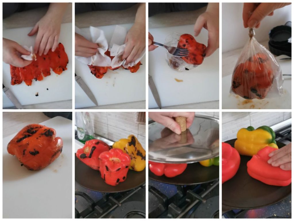 Wir legen die Paprika auf eine gut erhitzte Grillplatte, die Haut muss auf allen vier Seiten verbrannt werden. Drücke die Paprika nach unten, damit die Haut mit der Grillplatte in Kontakt bleibt. Sobald sie gut geröstet ist, auch oben und unten, legen wir sie in einen Lebensmittelbeutel (wenn du am Kauf interessiert bist, klicke hier) und lassen sie in ihrer Hitze für etwa 15 Minuten garen, dies erleichtert das gleichmäßige Ablösen der Haut