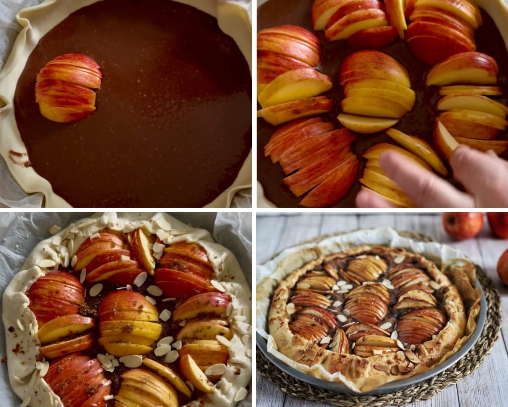 Wir verteilen die Haselnuss- und Kakaocreme auf dem Boden, lassen dabei einen Rand von etwa 2 cm. Die in Gruppen gesammelten Apfelscheiben darauf legen, dann den Rand des Blätterteigs leicht umklappen, mit Milch bestreichen und mit gehackten Haselnüssen oder Mandelblättchen bestreuen. Die Äpfel mit etwas braunem Zucker und einer Prise Zimt bestreuen. Im vorgeheizten Ofen bei 180° 35 Minuten backen. Kalt oder warm servieren.