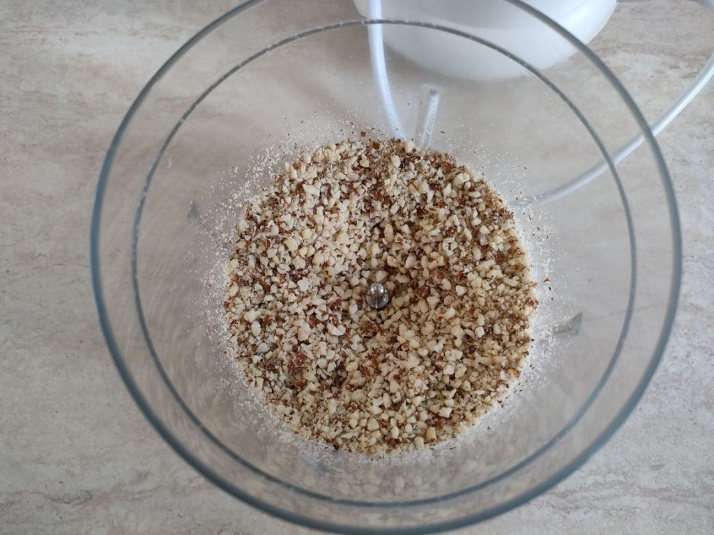 Wir bereiten die Pfirsiche vor, die Amaretti und die Nüsse. Wenn Sie Nektarinen verwenden, waschen Sie sie, ohne sie zu schälen, 2 Pfirsiche in Scheiben und 2 in Würfel schneiden. Zerbröseln Sie die Amaretti mit einem Fleischklopfer und zerkleinern Sie die Nüsse mit einem Zerkleinerer