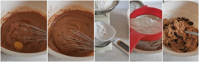 Wir fügen ein Ei nach dem anderen hinzu, immer gut rühren. Dann das gesiebte Mehl mit dem Backpulver und dem Natron, das Salz und die Hälfte der gehackten Schokolade. Alles gut mischen, bis ein eher dicker Teig entsteht.