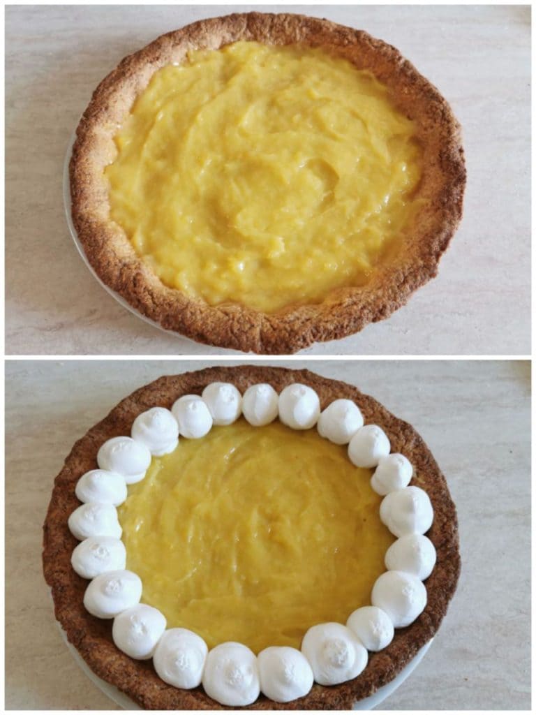 Wenn alle Zutaten abgekühlt sind, fahren wir mit dem Zusammenbau der Torte fort. Füllen Sie die Mürbeteigschale mit der Zitronencreme, glätten Sie sie. Füllen Sie das Baiser in einen Spritztüte(falls Sie interessiert sind, klicken Sie hier) mit einer großen Düse, und formen Sie viele Baiserkugeln auf der Oberfläche, beginnend von außen nach innen.