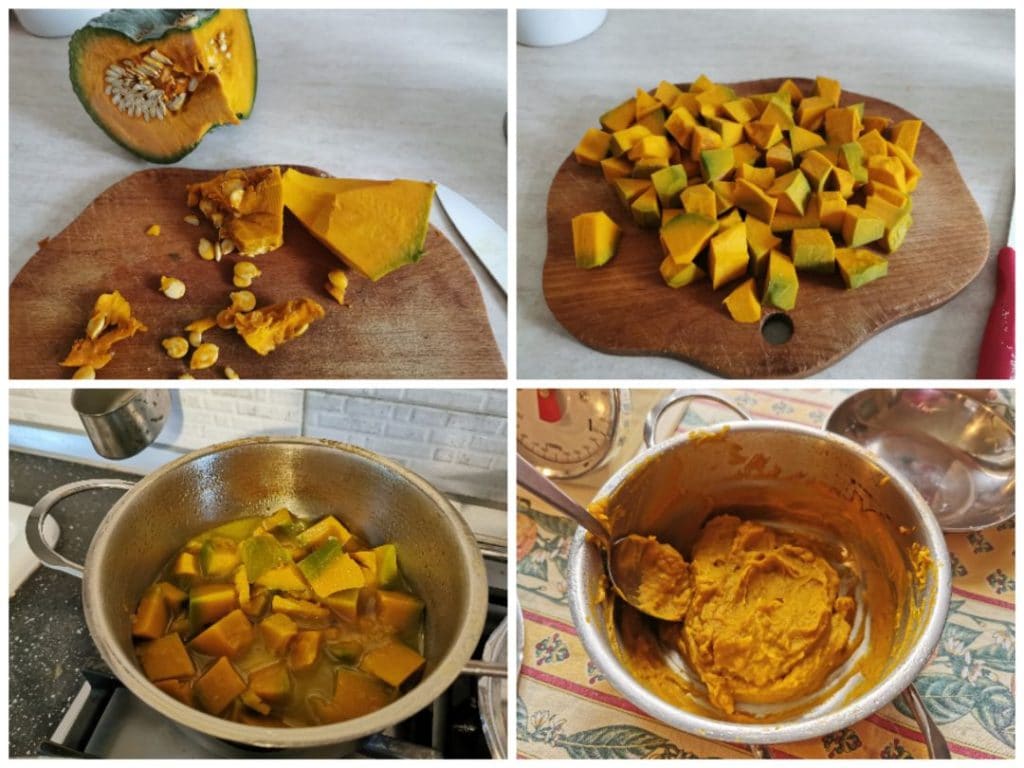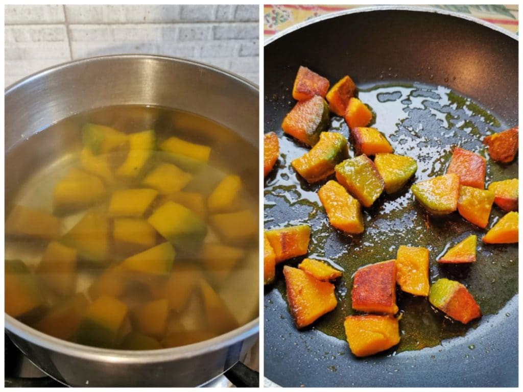 Den restlichen Kürbis blanchieren wir für einige Minuten in einem Topf mit etwas Wasser, dann gießen wir ihn ab und beenden das Kochen in einer Pfanne mit dem restlichen Öl