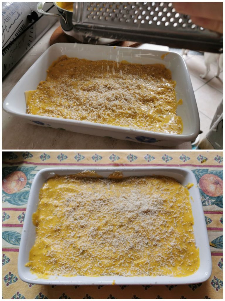 Beginnen wir mit einer ersten Schicht Béchamel, dann das Pastablatt, bis die gesamte Auflaufform bedeckt ist. Bedecken wir mit der Béchamel, angereichert mit dem Salbeipesto und dem Kürbispüree, und bestreuen mit dem geriebenen Käse. Fügen wir einige Stückchen vorher gebratener Kürbis hinzu und gehen zum zweiten Schicht, gleiche Prozedur, schließlich zum dritten Schicht