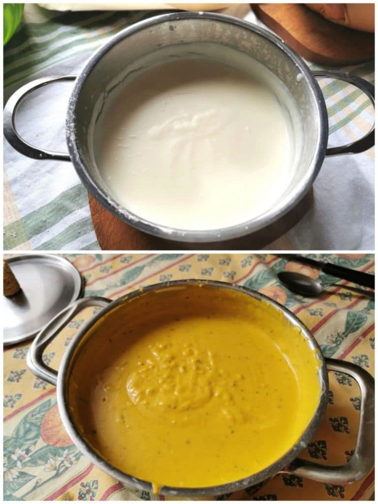 Bereiten wir die Béchamel zu, für das Rezept klicken Sie hier. Danach fügen wir nach und nach das Kürbispüree zur Béchamel hinzu, vorsichtig mit einem Schneebesen umrühren, um es zu integrieren