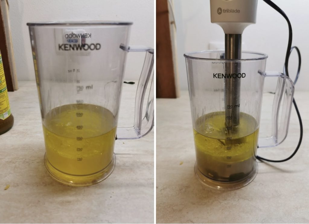 Aufschlagen: Beginne zu mixen und gieße gleichzeitig das Pflanzenöl sehr langsam in dünnem Strahl hinzu.