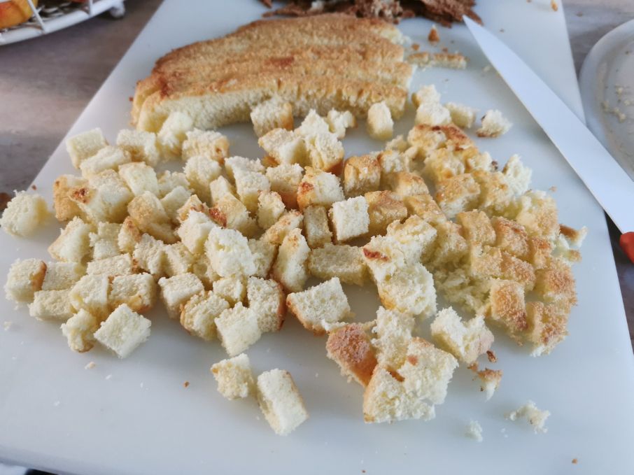 Sobald es fertig ist, lass es abkühlen und schneide 3 dünne Scheiben ab. Schabe die ganze braune Kruste vom ersten Kreis ab, mache es mit einem kleinen Messer leicht, danach schneide sie in viele Stücke von etwa 1 cm.
