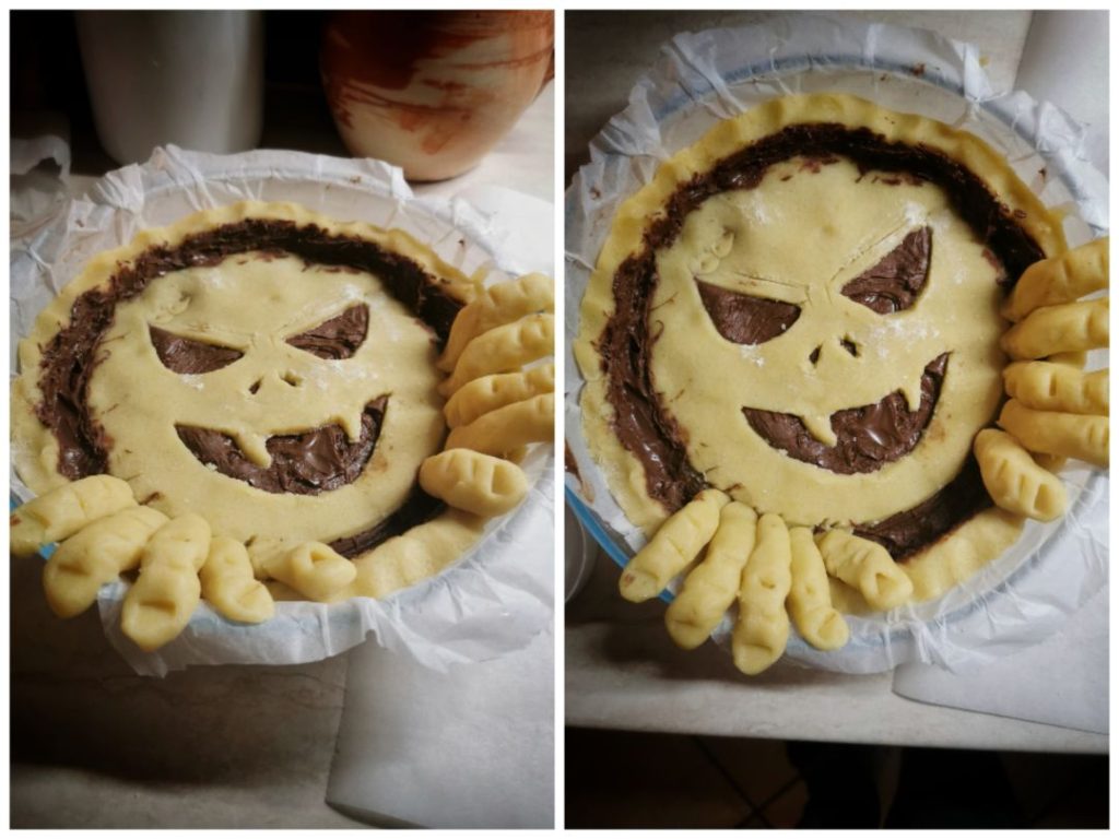 Mit dem übrig gebliebenen Teig machen wir kleine Würstchen, die wir als Finger verwenden. Wir platzieren sie auf der Kruste, indem wir sie ein wenig drücken und die Basis mit etwas Wasser befeuchten, um sie zu befestigen, sodass sie aussehen, als wollten sie aus dem Kuchen herauskommen. Streue etwas Zucker darüber. Im vorgeheizten statischen Backofen bei 160° für 40 Minuten backen.
