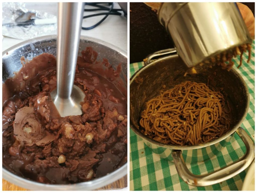 Pürieren Sie die Masse schließlich mit einem Stabmixer oder mit der Kartoffelpresse, bis Sie ein glattes Kastanienpüree ohne Klumpen und ziemlich dicht erhalten, fügen Sie einen gehäuften Esslöffel Kakaopulver hinzu. Lassen Sie es abkühlen, dann geben Sie die Creme zurück auf den Herd in einem kleinen Topf, fügen Sie die Sahne und die Butter hinzu, rühren Sie gut um, lassen Sie es abkühlen