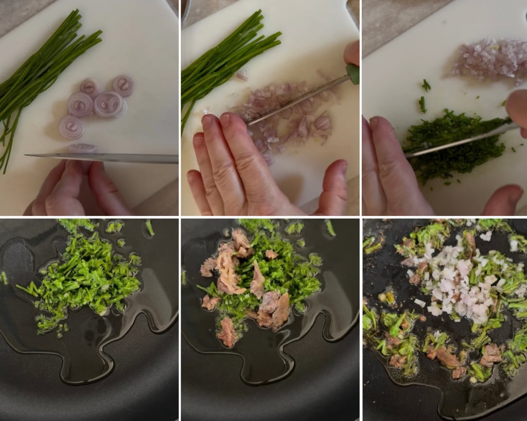 Bereiten wir die Basis vor: Schneiden Sie die Zwiebel dünn. In einer großen Pfanne das Olivenöl extra vergine bei niedriger Hitze erhitzen und, falls verwendet, den Chili. Fügen Sie die Sardellen und die Petersilienstängel hinzu. Lassen Sie alles ein bis zwei Minuten sanft anbraten, dann die Zwiebeln hinzufügen und sanft für 10 Minuten schmoren lassen, Salz hinzufügen. Auf diese Weise verlieren sie ihr Wasser und werden weich, ohne dass zusätzliche Flüssigkeiten hinzugefügt werden müssen. Erst nachdem die Zwiebeln gut karamellisiert sind und wie eine Creme aussehen, einen Schöpflöffel Wasser hinzufügen.