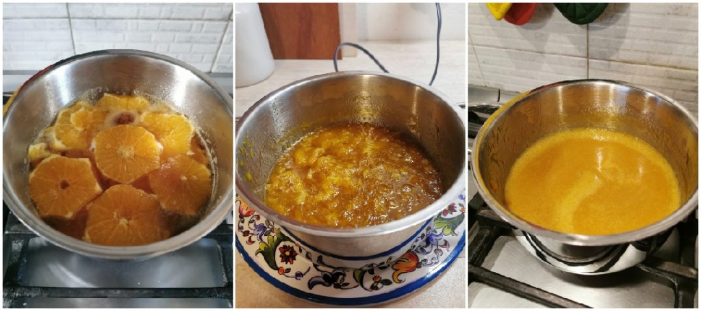 Mische das Pektin mit dem Zucker und füge es in den Topf mit den Zitrusfrüchten, zusammen mit 120 ml Wasser, und koche es bei niedriger Hitze für 20/25 Minuten. Danach vom Herd nehmen, die Scheiben für die Dekoration der Torte beiseitelegen, und alles mit einem Stabmixer pürieren, bis eine Creme entsteht, abkühlen lassen.