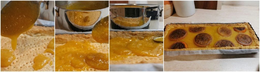 Jetzt können wir die Mürbeteigschale mit der Marmelade füllen und mit den vorher beiseitegelegten Zitrusscheiben dekorieren. Du kannst mit Mandelblättchen garnieren, um einen zusätzlichen Touch zu verleihen